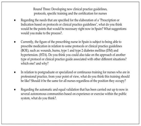 From the results of Round Two, many of the topics related to NPM in Spain were found to be useful for generating the third questionnaire, whose aims focused on current clinical practice protocols or guidelines, with special emphasis on possible improvements for the creation of future specialized ones. Moreover, it was decided to complementary ask them about the training available and the accreditation process required for nurses in Spain. Furthermore, a new file was also attached to be completed by the experts, asking about their sociodemographic data, including their gender, autonomous community and province, professional position, professional experience in years, academic level, as well as a question regarding their areas of expertise, research, or projects in which they have participated in relation to NPM. This email was sent in November 2022. See in Figure 3 the questions corresponding to Round Three: