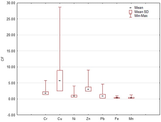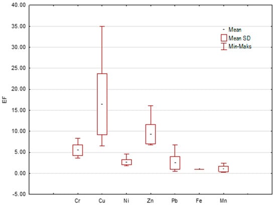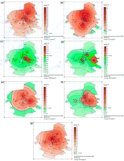 - Spatial distribution analysis indicated areas with high levels of Cr, Cu, Ni, Zn and Pb are mainly located in the central and eastern parts of the city where heavy traffic and the presence of commercial and administrative centers, bus stops dominate. The spatial distribution of Mn and Fe is different, these areas are mostly found in the eastern part of Suwałki where there is less traffic and a higher proportion of cultivated land of different nature is visible. Consequently, Fe and Mn may be partly of geogenic origin in these areas;