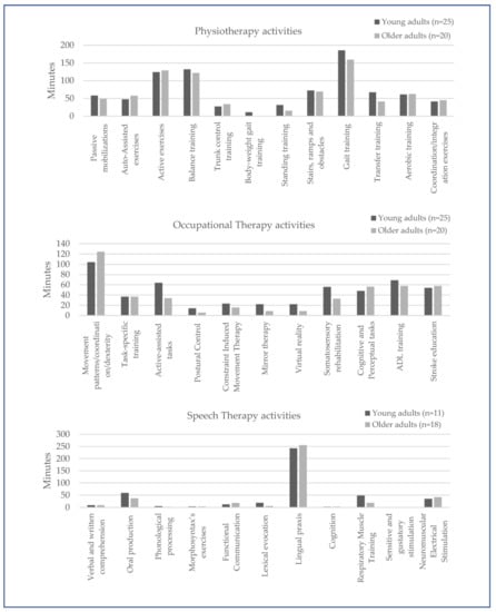 - Bode, R.K.; Heinemann, A.W.; Semik, P.; Mallinson, T. Patterns of therapy activities across length of stay and impairment levels: Peering inside the "black box" of inpatient stroke rehabilitation. Arch. Phys. Med. Rehabil. 2004, 85, 1901–1908. [Google Scholar] [CrossRef] [PubMed]