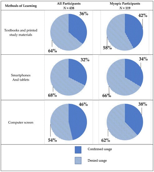 In non-myopic participants, usage of computer screens for learning is almost evenly split: 50.47% (n = 161) participants use them, while 49.53% (n = 158) declared no usage. In the myopic group, only 37.82% (n = 45) declared using computer screens for learning, and 62.18% (n = 74) did not use them. The differences in computer screen usage between myopic and non-myopic participants have reached statistical significance (p = 0.03 in Pearson’s χ2 test). The usage of smartphones and tablets was similar for both groups (31.97% declared usage in the non-myopic group and 33.61% in the myopic group). The comparison did not reach statistical significance (Pearson’s χ2 test; p = 0.74). Textbooks and other printed learning materials were used by 33.86% of non-myopic participants and 42.02% of myopic participants. Differences in the usage of printed materials were also insignificant (Pearson’s χ2 test; p = 0.11). All differences in preferred methods of learning are displayed in Figure 1.