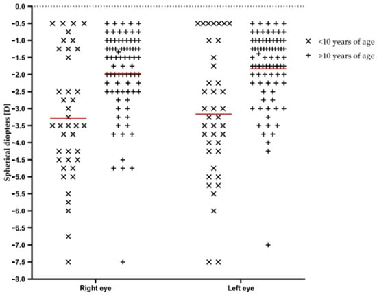 Correlation between age of diagnosis and value of current refractive error was found with the U-Mann Whitney test (U = 918.00; Z = −3.72; p < 0.01 for the right eye, U = 925.00; Z = −3.68; p < 0.01 for the left eye). Refractive error values depending on participants’ age of diagnosis are shown in Table 4 and Figure 2. The hypothesis of normality of distribution was rejected in both eyes for both age ranges (W. Shapiro Wilk test).