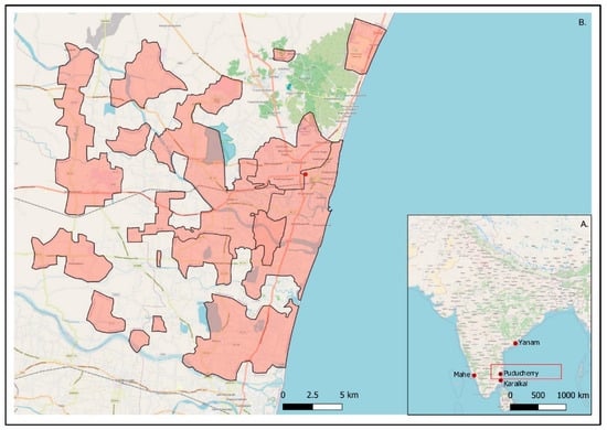 Puducherry is a unique Union Territory (UT) in India, comprised of four erstwhile French colonies (i.e., Puducherry District; Karaikal; Mahe; and Yanam region) in the south-eastern part of India (Figure 1A). The total area of the UT is 492 km2.