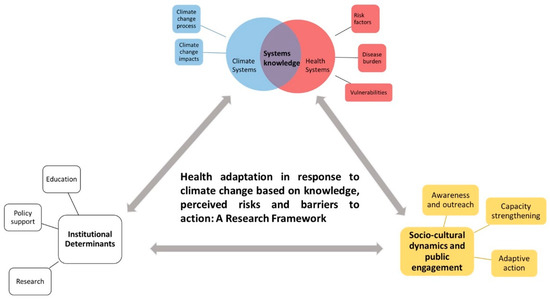 A framework for health adaptation action in the context of climate change based on knowledge and perceived health risks, policy and institutional support and public engagement. The coloured parts highlights the thematic areas we focus on in this paper. The three main components have been shown in bold text.