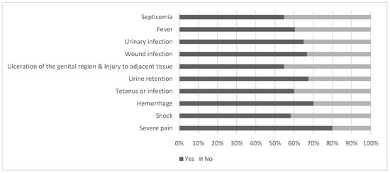 Only 3.3% of the participants considered FGM/C as an easy procedure without complications. According to participants, severe pain (80%), hemorrhage (70%), urine retention (67.5%), wound infection (66.7%), urinary-tract infection (65%), fever (65%), and septicemia (57.5%) were the most possible immediate complications of FGM/C (Figure 1).
