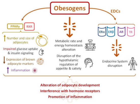 In the past few decades, a growing body of evidence has shown that some environmental pollutants and chemicals are capable of promoting obesity, the so-called obesogens. Most of these types of pollutants (e.g., bisphenol A (BPA), phthalates, or dioxins) belong to the group of compounds known as endocrine disrupting chemicals (EDCs), which have been defined by the Endocrine Society as “exogenous chemicals, or mixture of chemicals, that interfere with any aspect of hormone action” [7] (Figure 1). Although the mechanisms of action are far from being completely understood, three of them are postulated as the most important mechanisms by which obesogens exert their effects: (i) altering adipocyte development; (ii) interfering with hormone receptors; and (iii) promoting inflammation. Obesogens are able to dysregulate adipocyte homeostasis through interacting with peroxisome proliferator-activated receptor gamma (PPARγ) and 9-cis receptor retinoic acid (RXR), and lead to an increased number and size of adipocytes, impaired glucose uptake and insulin signaling, reduced expression of brown adipocyte markers, and inflammation [8]. Furthermore, obesogens can indirectly promote obesity by altering the metabolic rate and energy homeostasis and disrupting the hypothalamic regulation of appetite and satiety [9]. They can also imitate the effects of natural estrogens by binding to their receptors (ERα and ERβ) and they interfere with androgen receptors (ARs) [10] and thyroid hormone receptors (TRs) [11], thus disrupting the endocrine system [12]. Current knowledge on molecular mechanisms underlying the action of obesogens has been recently reviewed elsewhere [13].