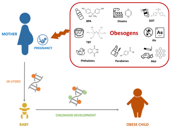 Although the genetic factors involved in the development of childhood obesity are only partially known, several studies have associated different epigenetic changes during the first months of life and the risk of obesity in the long term. Within these epigenetic changes, the analysis of changes in DNA methylation are the most studied in relation to increased adiposity [14]. In the case of adiposity in newborn children, these changes are mainly influenced by environmental factors related to the mother, such as obesity at the time of pregnancy or the lifestyle during pregnancy [15,16,17]. For example, methylation of the cg11531579 island (checkpoint with forkhead and ring finger domains genes, CHFR) site has been recently reported to be associated with rapid weight gain at early ages of life and the development of long-term obesity [14]. This agrees with the fetal origins of health and disease hypothesis, which states that the risk for the development of long-term diseases is associated with the events that occurred during early developmental periods, such as maternal exposure to environmental toxins [18]. For instance, it has been demonstrated that maternal smoking during pregnancy can lead to a decreased birthweight and an increased risk of obesity development during childhood [19]. Thus, due to their ability to promote epigenetic dysregulation on exposed individuals, obesogens have lately aroused the interest of researchers. Furthermore, prenatal exposure to these obesogens can cause epigenetic modifications that may produce adverse phenotypic outcomes in adulthood and may even be transferred to subsequent generations [20].