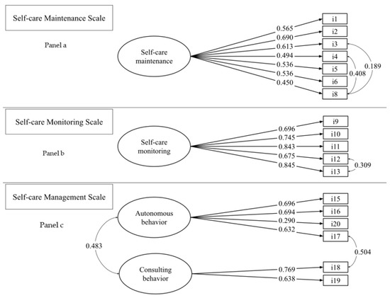 Since self-care management is described as comprising autonomous behaviors and consulting behaviors [17], we tested a two-factor confirmatory model, The model yielded a poor fit. The misfit was caused by excessive covariance between items #17 “Take a medicine to make the symptom decrease or go away” and #18 “Tell your healthcare provider about the symptoms at the next office visit”. Additionally, in this case, as for the self-care maintenance scale, the proximity effects of these items could have produced an increase in the shared variance. We allowed the correlation between item residuals [50,51], and the fit indexes of the new model improved: χ2 (7, N = 226) = 10.027, p = 0.20, CFI = 0.985, TLI = 0.968, RMSEA = 0.044 (90% CI 0.000 0.099), p = 0.506, SRMR = 0.035. All factor loadings were significant, and two factors correlated 0.483 (p < 0.001), (Figure 1, panel c).