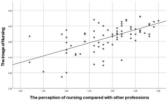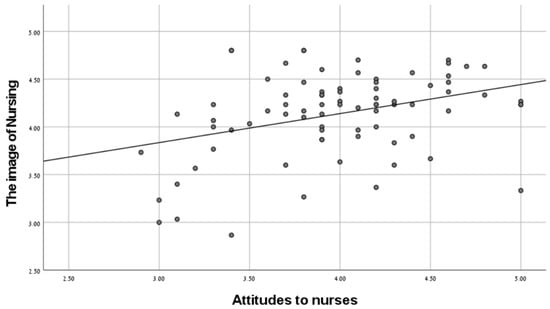Table 1 shows that the mean of the attitudes toward nurses, the perceptions of nursing in comparison to other professions, and the image of nursing were 3.98, 3.92, and 4.14 (on a scale of 5), respectively, which indicates a high level of these variables. It can also be seen that a significant positive relationship was found between the attitudes to nurses and the image of nursing in the wake of the pandemic (r = 0.62, p < 0.01), and a significant positive relationship was found between the perception of nursing compared to other professions and the image of nursing in the wake of the pandemic (r = 0.35, p < 0.01), as hypothesized. See Figure 1 and Figure 2.