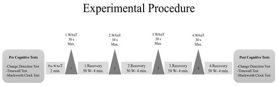 Following the completion of the pre-cognitive testing, a warm-up protocol was performed by the participants on a cycle ergometer, which included three short sprints in 5 min. Afterward, the participants were allowed to perform some self-selected stretching exercises. After the warm-up, the participants started pedaling for 2 min at 60–70 rpm at 50 W (the Pre-Want Session). The Wingate Anaerobic Test (WAnT), which is an all-out test to determine the level of anaerobic performance, was performed by all participants using a cycling ergometer (Monark 839E, Varberg, Sweden) four times with 4 min of active recovery (Rcy) between the repetitions [,]. During the WAnT, the participants were asked to use maximum effort, pedaling at a maximum speed for 30 s against a load of 80 g/kg of their body weight [,]. The entire exercise session lasted approximately 20 min (Figure 1). The Monark All-in-One software (ver.1.0.10.0) automatically calculated the peak power (PP) outputs of each participant, which were recorded during the WAnT [].