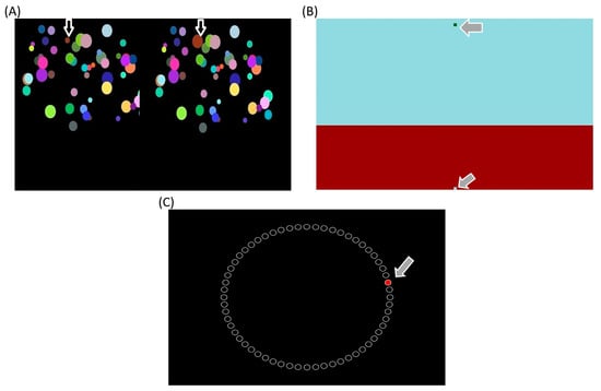 The Change Detection Test measures visual spatial attention and working memory [,]. In this cognitive test, the participant was asked to recognize the change in two alternating visual scenes as soon as possible, which consisted of circles of various sizes and colors whose color, size, or position changed or disappeared in a flashing pattern on the screen (Figure 2A). The Change Detection Test consists of 20 trials. In this test, the response times of the participants and the number of correct answers were used to gauge cognitive performance (i.e., a faster response time and higher accuracy reflecting better performance). This test coincides with the necessity for basketball players to find the most accurate one among many changes in the game as soon as possible.