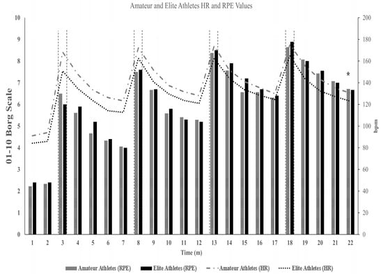 Mean of heart rate (HR) and ratings of perceived exertion (RPE) values of the amateur and elite basketball players during the entire SIT session. The left Y-axis shows the RPE (1–10 Borg Scale) values, while the right Y-axis shows HR values (in beats per minute). The X-axis shows the time in intervals of a minute, which starts with the beginning of the pre-want session and covers the whole SIT protocol. * denotes significant differences in HR values, p < 0.05.