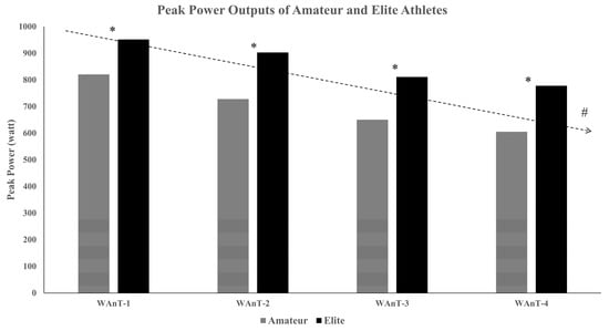 Peak power outputs of amateur and elite basketball players. * denotes significant differences between the amateur and elite groups, p < 0.05, # denotes a significant difference in the repetition within groups with a p < 0.05.