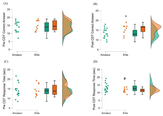 Change Detection Test (CDT) pre- and post-exercise comparisons between amateur (green) and elite basketball players (orange). (A) Pre CDT-Correct Answers (B) Post CDT-Correct Answers (C) Pre CDT-Response Time (D) Post CDT-Response Time * denotes significant differences between the amateur and elite groups, p < 0.05; # denotes within group pre-post comparisons with a p < 0.05.