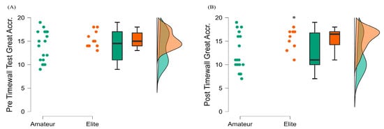 Timewall Test pre- and post-exercise comparisons between amateur (green) and elite (orange) basketball players. (A) Pre Timewall-Test Great Accuracy Scores (B) Post Timewall-Test Great Accuracy Scores * denotes significant differences after exercise between the amateur and elite groups, p < 0.05.