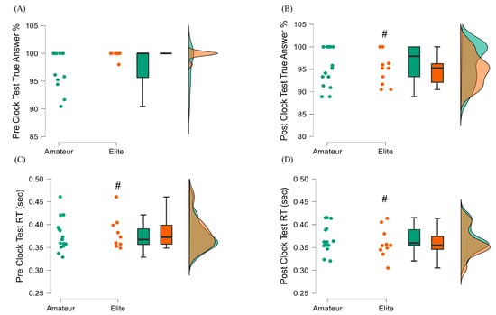 Mackworth Clock Test pre- and post-exercise comparisons between amateur (green) and elite (orange) basketball players. (A) Pre-Clock Test True Answers % (B) Post-Clock Test True Answers % (C) Pre-Clock Test Reaction Time (D) Post-Clock Reaction Time # denotes statistically significant different within group pre-post comparisons, p < 0.05.