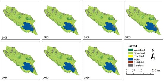 | LULC | United States Geological Survey (https://glovis.usgs.gov (accessed on 1 June 2022)) | 30 m | 1990, 1995, 2000, 2005, 2010, 2015, 2020 | providing the LU type data |