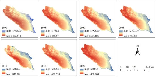 | R [28,29,30,31] | The National Qinghai–Tibet Plateau Scientific Data Center of China (https://data.tpdc.ac.cn (accessed on 1 June 2022)) | 1000 m | 1990, 1995, 2000, 2005, 2010, 2015, 2020 | extracting the mean value of the dataset to generate the mean annual rainfall |