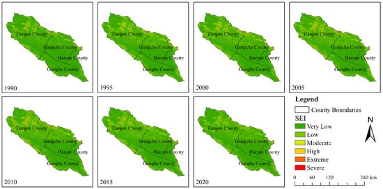 3.1. Spatiotemporal Variation Characteristics of SE in the QLB