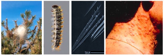 - Battisti, A.; Larsson, S.; Roques, A. Processionary moths and associated urtication risk: Global-change driven effects. Annu. Rev. Entomol. 2017, 62, 323–342. [Google Scholar] [CrossRef] [PubMed]