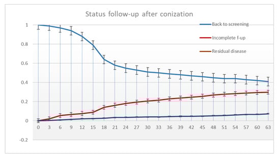 We defined residual disease as histologically confirmed CIN2+. Recurrent disease was defined as a histologically confirmed diagnosis of CIN2+ after two consecutive, negative co-tests. We classified women awaiting treatment, colposcopy/biopsy, or further follow-up for abnormal cytology/HPV results at study end as having "incomplete follow-up". The post-treatment follow-up time was calculated as the time in months between the treatment and the highest histological outcome of CIN2+, the date of the last follow-up visit, the date at which the woman was returned to 3-year screening, or the study end (31 December 2021), depending upon the outcome.