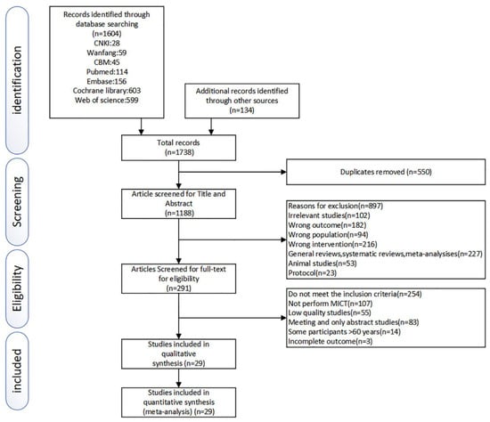 As shown in Figure 1, the search strategy retrieved 1604 studies from electronic databases and 134 studies from references and other sources. After removing the duplicates, 1188 studies were evaluated via title and abstract, and 291 studies remained to be full-text screened. After diligently reviewing, 254 studies were removed for not meeting the inclusion criteria. Finally, 29 studies were evaluated as eligible and included in this analysis.