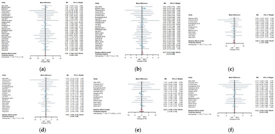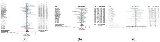 Forest plot for between-group effects of HIIT and MICT. (a) Forest plot for between-group effects of HIIT and MICT on body mass(BM); (b) Forest plot for between-group effects of HIIT and MICT on body mass index(BMI); (c) Forest plot for between-group effects of HIIT and MICT on waist circumference (WC); (d) Forest plot for between-group effects of HIIT and MICT on percent fat mass (PFM); (e) Forest plot for between-group effects of HIIT and MICT on fat mass (FM); (f) Forest plot for between-group effects of HIIT and MICT on fat-free mass (FFM); (g) Forest plot for between-group effects of HIIT and MICT on VO2peak; (h) Forest plot for between-group effects of HIIT and MICT on systolic blood pressure(SBP); (i) Forest plot for between-group effects of HIIT and MICT on diastolic blood pressure(DBP) [41,42,43,44,45,46,47,48,49,50,51,52,53,54,55,56,57,58,59,60,61,62,63,64,65,66,67,68,69].