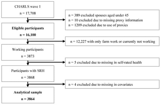 We used data from the China Health and Retirement Longitudinal Study (CHARLS), a nationally-representative study conducted among community residents aged 45 years or older living in 28 Chinese provinces [,]. Institutionalised individuals were not sampled []. CHARLS is intended to provide micro, longitudinal data, covering health measures and indicators of socio-economic status, of the middle-aged and older working population, for the study of Chinese age-related demographic issues []. Information on family, health status, healthcare, work circumstances, and economic status was collected []. The CHARLS national baseline survey was conducted between 2011 and 2012 [], and four national waves are available. The first national survey was used in the present study. Further information about CHARLS can be found in the CHARLS cohort profile and users’ guide [,]. The sample-selection procedure used for the current study is illustrated in Figure 1.