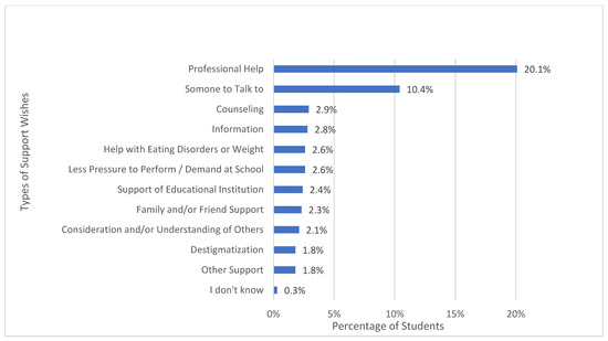 Some participants (2.6%, n = 16) wished for “help with eating disorder or weight”. In this category, wishes for help with an eating disorder or abnormal eating behavior, as well as body dysmorphia, were subsumed. Some students named the desire to eat less, have an exercise partner, or someone who created a diet plan for them, so they would stop gaining weight. However, the category also referred to the wish for education on healthy eating behavior and body positivity. Participants expressed that they wanted to “learn more about healthy nutrition. What diet suits me and my body” (Respondent 278) or “overcome my eating disorder, no matter what” (Respondent 184). Some students asked for professional help in dealing with their eating disorders. Such cases were coded as both “professional help” and “help with eating disorder or weight”.