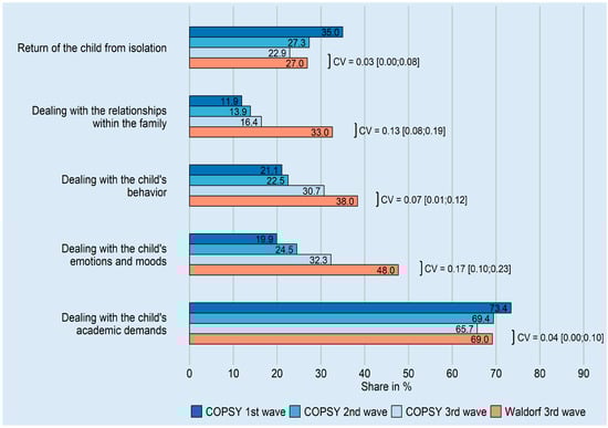 Our findings are consistent with research worldwide that highlights parents’ concerns about their children’s academic performance and mental state and the need for support during homeschooling [,,]. In Germany, the COVID-19 Snapshot Monitoring (COSMO) project was conducted; this included a repetitive cross-sectional survey with approximately 1000 respondents per survey wave. Particularly during the first wave of the pandemic, parents of school-aged children indicated a significantly higher burden compared to the general study population []. The Germany-wide COPSY study covered the first three waves of the pandemic. Parents participating in the three COPSY surveys reported a high need for support regarding their children’s academic demands. However, this specific need decreased over the course of the three pandemic waves (Figure 1), which could be related to a growing routine and confidence. In contrast, dealing with the child’s emotions and moods, behavior, and relationships within the family became more prominent across the three waves, with parents expressing an increasing need for support (Figure 1) (Ravens–Sieberer, personal communication). Other studies addressing the psychosocial situation within families during the pandemic reported similar findings [,,]. Based on the German CoCo–Fakt Cohort study (Cologne–Corona Counselling and Support for Index and KontAKt Persons during the Quarantine Period), Nöthig et al. reported that family stress was significantly higher if at least one child was quarantined, emphasizing the additional burden of isolation. The authors also found a clear interaction between parental stress and children’s psychological distress [].