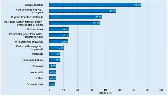 Information on how, or from whom, parents would like to receive support in dealing with their children during the COVID-19 pandemic. Indicated is the share of parents who answered that they always/rather often/occasionally needed support (n = 279).