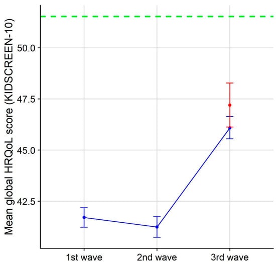 Mean global HRQoL scores (KIDSCREEN-10) and 95% confidence intervals for the Waldorf third-wave sample (in red) and for the COPSY first-, second-, and third-wave samples (in blue) (data provided by U. Ravens-Sieberer). The green-dashed line shows the German national norm data for the KIDSCREEN-10 HRQoL score of 8–18-year-old children from the proxy report (Table A7_B-32, []).