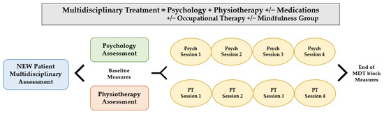 Patient flow from new intake to completion of MDT block. Psych: psychology, PT: physiotherapy, MDT: multidisciplinary.