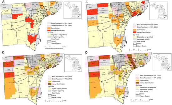 Gentrification in Wayne County from (A) 1980 to1990, (B) 1990 to2000, (C) 2000 to2010 and (D) 2010 to2020.