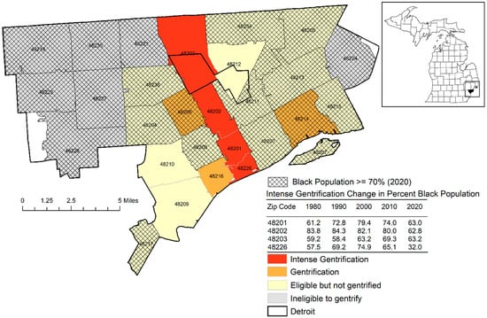 The association between changes in racial distribution and gentrification was analyzed. Specifically, zip codes that experienced intense gentrification also had a substantial displacement of the African-American population between 2010 and 2020 (range—11% to 33% decrease). In fact, each of the 4 zip codes comprising Gentrification Alley were the only zip codes within all of Detroit to have African-American percentages less than 70 percent.