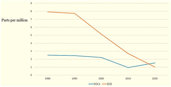 Pollutant levels from 1980 to 2020 for VOCs and SO2.
