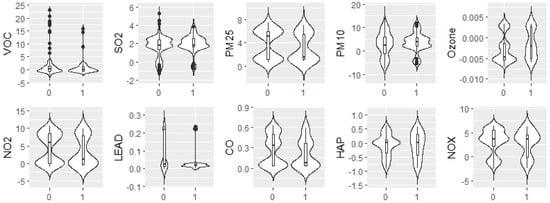 Next, binomial regression analyses were performed to examine the association between the probability of an area being gentrified and decadal changes in air pollutants. We recorded all zip codes in the county as either gentrified (=1) or non-gentrified (=0). The independent variables were the degrees of variation in air pollutants between 1980 and 1990, 1990 and 2000, 2000 and 2010 and 2010 and 2020. These analyses were performed while controlling for the change in total population, change in the percentage of the African-American population and change in the median income level of each area. When comparing these areas, non-gentrified areas generally had larger improvements in air quality than gentrified areas. Six pollutants (VOCs, PM2.5, NO2, lead, CO and NOx) in particular had a larger mean improvement in non-gentrified areas. Figure 4 shows violin plots of variation of air pollutant variation over time. When examining PM2.5, for example, nearly half of the non-gentrified areas had a large decrease in PM2.5 (range 4–8 units). In contrast, most gentrified areas had only a small improvement (range 0–4 units).