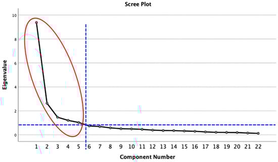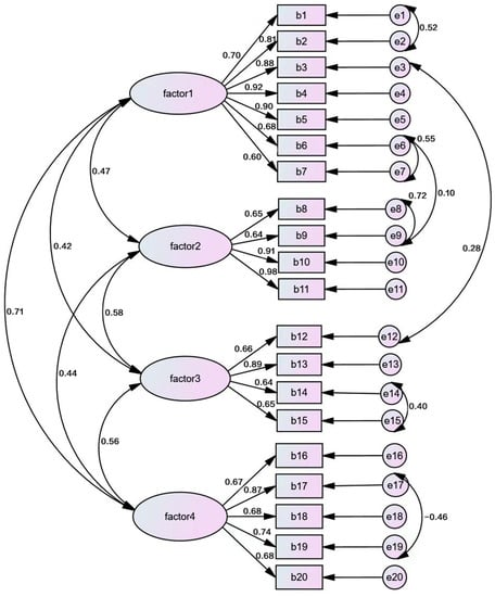 In this study, we chose principal axis factoring (PAF), Direct Oblimin rotation, the Kaiser–Meyer–Olkin (KMO) test, the Bartlett’s test, a scree plot, and parallel analysis (PA) to conduct exploratory factor analysis on 22 items. The KMO was 0.906 (greater than 0.80 [] (pp. 159–265)) and X2 was 3153.739 (p = 0.000 < 0.05) in Bartlett’s sphericity test, which indicated that there were common components among items and it was suitable for exploratory factor analysis. According to the result of the PAF and Direct Oblimin rotation (Table 4) (using the Kaiser–Guttman criterion: eigenvalue >1 [] (pp. 209–237)) and the scree plot (Figure 1), five common components were retained. However, the results of the PA only indicated two common factors (Table 4), which could not be explained by our theoretical framework. In addition, Factor 5, containing items 14 and 15, was deleted after Direct Oblimin rotation since the items of a factor load should be equal to or greater than three, otherwise the content validity is not sufficient to measure the factor characteristics [] (pp. 159–265). Combining the above analyses and our theoretical framework, we retained four common factors, containing twenty items.