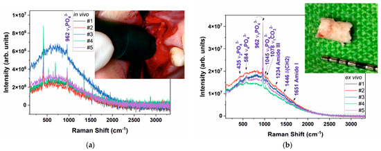 All ex vivo spectra have a better signal-to-noise ratio and most common Raman bands for both organic and mineral are easily discernible. For in vivo measurements, all Raman spectra are noisy and only the strongest band at about 962 cm−1 related to the ν1PO43− vibration is clearly visible along with the broad luminescence centered at about 700 cm−1 that we assigned to the second order luminescence from collagen type I [26,27] (Figure 4a). Patient #2 and patient #3 are belonging to different “classes”; #3 is a patient with certain previous periodontal disease, while #2 is a certain healthy patient. All others are former previous periodontal.
