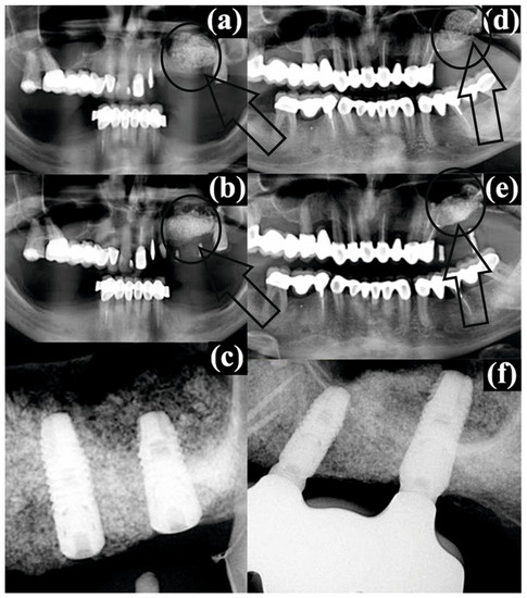 Radiographic images of patient #2: (a) the augmented bone in the left sinus immediately after sinus floor augmentation-highlighted with arrow and circle, (b) postoperative conditions after 4 months of healing-highlighted with arrow and circle, (c) dental implants in the augmented bone at 7 months after augmentation; and patient #3: (d) the augmented bone in the left sinus immediately after sinus floor augmentation-highlighted with arrow and circle, (e) postoperative conditions after 4 months of healing-highlighted with arrow and circle, (f) dental implants in the augmented bone at 7 months after augmentation. The augmentation loci are encircled and arrow are pointing to the regions of interest.