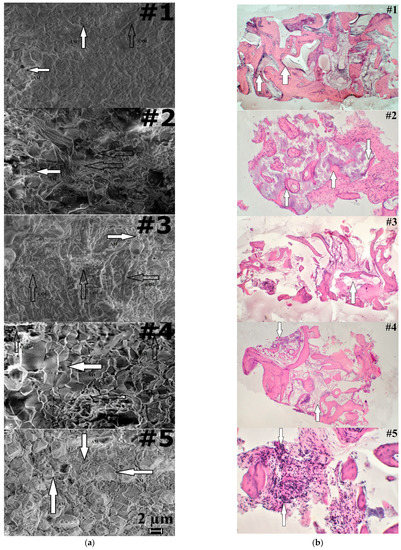 (a) SEM micrographs of bone samples, magnification 10,000X. Legend: COL—collagen (white arrows), AM—bone augmentation material (black arrows); (b) Histology, morphological changes reflecting the condition of the biological augmentation process using HAP (Cerabone) as bone substitute. Changes are indicated by arrows for the specific areas.