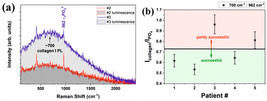 The ratio of the second order luminescence band at ~700 cm−1 to the strongest phosphate band at about 962 cm−1 that is related to ν1PO43− vibration will provide a ratio between the amount of collagen and crystalline apatite. This ratio is not expected to be linear as luminescence and Raman scattering are probing different energy levels but, nevertheless, it is sensitive to the bone health condition. The results for the ratio of collagen to apatite obtained by in vivo Raman spectroscopy are plotted in the Figure 4b for all patients. An estimated error of 20% is expected for our data. The ratios under 0.7–0.725 are characteristic for healthy patients, while a ratio that exceeds that value is representative for periodontal patients.