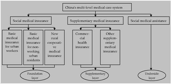 For a long time, it has been difficult and expensive to see a doctor in China, and the problem of poverty due to illness is still prominent. Whether or not these problems can be properly solved is directly related to the realization of China’s goal of a harmonious socialist society and the consolidation of the achievements of reform and opening up. “Medical reform” is an effective measure to solve these problems. At present, China has established four basic medical insurance systems, namely, basic medical insurance for urban workers, basic medical insurance for non-working urban residents, new rural cooperative medical insurance and social medical assistance. However, since the burden of this is mainly borne by the state and given China’s large population base and low level of economic development, it can only provide the most basic medical care for Chinese residents with a low level of security. It is unable to provide Chinese residents with higher level of protection and meet the needs of Chinese residents for personalized medical care. Therefore, it is urgent to establish and improve a multi-level medical care system to ease the financial burden of the government and provide better health care for people with different needs. To this end, commercial health insurance plays an irreplaceable role in making up for the shortage of basic medical insurance, improving the overall care level, meeting the diversified health care needs of the public, and establishing and improving a multi-level medical care system [1]. The structural framework of China’s multi-level medical care system is shown in Figure 1.