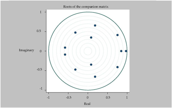 The sufficient and necessary condition for the stability of the SVAR model is that all the characteristic roots of the characteristic equation are in the unit circle [26,34,36], that is, the reciprocal of the roots of the polynomial equation with autoregressive coefficient are in the unit circle. In this part of the paper, model stability is tested (see Figure 2 for details). Since the model contains six endogenous variables and the optimal lag period is 2, the model has 12 eigenvalues. Figure 2 shows that all the 12 eigenvalues are within the unit circle, which indicates that the six-variable SVAR(2) model constructed in this paper is stable and the sample size is sufficient, which ensures the effectiveness of subsequent impulse response and variance decomposition analysis in this paper.