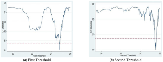 where represents different provinces; represents different years; reflects the individual effect of provincial differences; is the indicator function; is the random disturbance term; and are the threshold values of FDI and CSR, respectively; is the regression coefficient of each variable; PM, FDI and CSR are the explanatory variables (haze pollution) and threshold variables (FDI and CSR) of the study design; and EG, ES, IS, ER and IA are a set of control variables. After estimating the regression coefficients and the corresponding thresholds for each variable, the significance and authenticity of the thresholds were tested. The regression coefficients and corresponding threshold values were obtained based on the minimum sum of squared residuals of the variables under the given threshold number, and the existence of the threshold effect was tested according to the p-value. The consistency of the obtained threshold values with the actual values was evaluated using the likelihood ratio (LR) statistic.