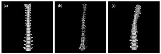 Examples of images that were included and excluded. (a) Included image: There was no defective or putrefied gas in the vertebrae body. (b) Excluded image: Most of the vertebrae bodies were replaced by putrefied gas and the shape of the vertebrae was unclear. (c) Excluded image: This is the case of death after burning. Although the lumbers remained, most of the thoracic vertebrae were defective.
