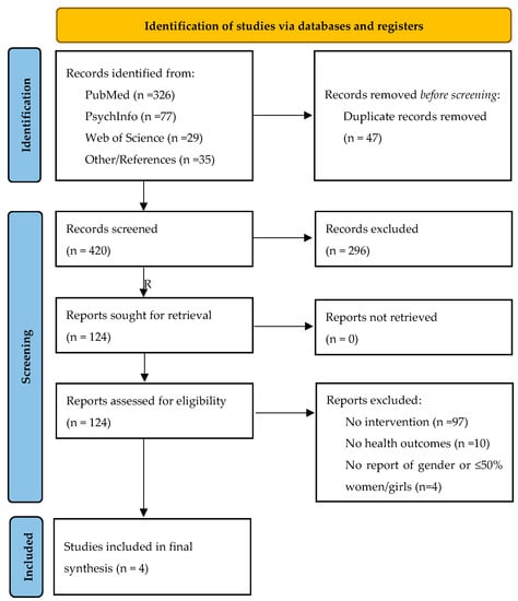 Based on the database searches, 432 records were identified, and 35 records were identified through citation searching. After removing duplicates, 420 records were screened by title and/or abstract for relevance. Four studies met all eligibility criteria and were included in the final analysis. An overview of the evidence selection process is shown in the PRISMA flow diagram (Figure 1) [].