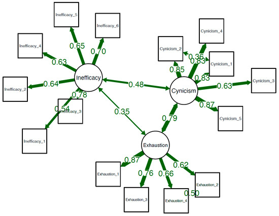 To measure academic burnout, the Maslach Occupational Burnout Inventory–Student Scale (MBI-SS) was used [40]. Upon entering the study, the authors did not have a Polish adaptation of the MBI in the student version. The study was preceded by the development of a Polish-language version of the tool and confirmation of its psychometric value. First, the items were translated into Polish, and then, a reverse translation into English was made by a translator unfamiliar with the original version (blind translation). The reverse translation was compared with the original version. After ensuring that both versions were equivalent, we conducted a validation study. To validate the tool, we checked its factorial structure, verified the fit of the three-factor model (detailed results of the confirmatory factor analysis are presented later in the article), and calculated the reliability of the tool (its internal consistency). After conducting an exploratory factor analysis, we noticed that one item, MBI_6 (“I feel burned out from my studies”), definitely loaded higher on the CY factor, whereas in the original version, it is part of the EX factor. Excluding this item improved the fit of the three-factor model.