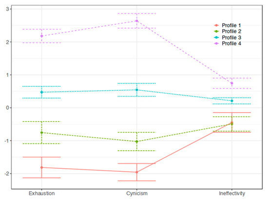 From the above results, we were able to move on to the next step, in which we performed latent profile analyses of the factors obtained from the CFA. The proposed latent models for different numbers of profiles were assessed using the fit indices described below (Table 1). The differences between the models were minor, so we decided to apply the model with four profiles. To validate our decision, we conducted MANOVA analysis. In both cases (four and five profiles), all profiles were different (p-value = 0 in Pillai’s trace test). In the next step, therefore, we decided to perform post hoc analyses (HSD test) to see which profiles specifically differed. In the case of four profiles, all profiles were different in all features. On the other hand, in the case of five profiles, we obtained four disjointed profiles in the case of exhaustion and even three profiles in the case of inefficacy. Only for cynicism did we obtain five disjointed profiles The selected model is detailed in Table 2 and Figure 2. The means and standard deviations of variables used to create the profiles are presented for each profile.