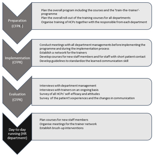 However, CST is rarely transferred into practice, and research on how to systematically implement and maintain the skills at an organisational level is limited [2,20,30,32]. A recent publication on a CST program for physicians providing advanced cancer care concluded that one should expect resistance and scepticism when implementing CST and thus highlights the importance of teaming up with management and gatekeepers and being prepared for implementation to take time [33]. The positive results in studies investigating the effect of CST on HCPs and patients conducted in Lillebaelt University Hospital [34,35,36,37,38] paved the way for an organisation-based implementation, including all HCPs at the hospital. The CST program ‘Clear-cut communication with patients’ includes (a) training of the trainers, (b) training of the staff, and (c) initiatives for the maintenance of communication skills [39,40].