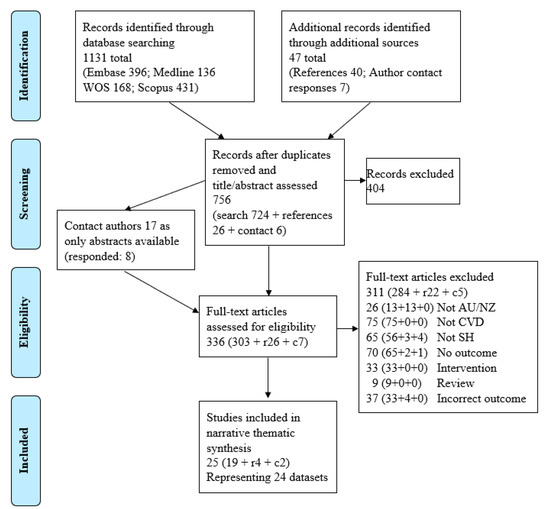Figure 1. Flow Diagram of Review Process. Acronyms: AU—Australia; c—contact (number of papers from contact with authors of included papers); CVD—Cardiovascular Disease; Datasets—number of study cohorts; NZ—New Zealand; r—references (number from searching the references of included papers); SH—Social Health; Studies—individual papers; WOS—Web of Science.